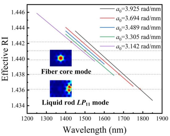When α0 was set to be 3.142, 3.305, 3.489, 3.694, 3.925 rad/mm, and nl = 1.484 the dispersion curves of liquid rod and the phase-matching point were calculated and plotted in Figure 2 respectively. But for the proposed sensor, the dispersion curve of fiber core mode is slightly different for each α0 and is not presented for clarity. The crossing points (namely, phase-matching points) of these two curves are marked by the yellow circles in Figure 2, respectively. It is worth to note that neff declines while α0 decreases at a certain wavelength. However, the resonant wavelength that corresponds to the phase-matching point shifts toward shorter wavelengths because of the decrease in α0. It should also be noted that the liquid rod supports a few high-order modes for each case of α0. To clearly discuss the tendency in phase-matching points, only one typical LP11 mode is plotted in Figure 2. Mode profiles of the fiber core mode and the liquid rod LP11 mode of the sample with α0 = 3.142 rad/mm can be seen as the inset of Figure 2.
