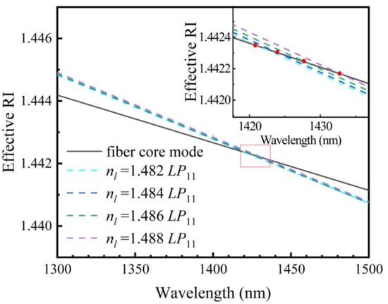 Meanwhile, the mode coupling characteristics of LFTPCFs with different RI liquids are also studied via numerical simulation. The calculated dispersion curves of the fundamental core mode and the rod mode LP11 are plotted in Figure 3, where one can see that both the effective modal RIs of the fiber core mode and the rod mode decreases with wavelengths increasing. At the same time, neff of the liquid waveguide is raised obviously with nl increases, as can be seen clearly in the inset of Figure 3, which results in the red shift of the phase-matching point that corresponds to the coupling wavelength.