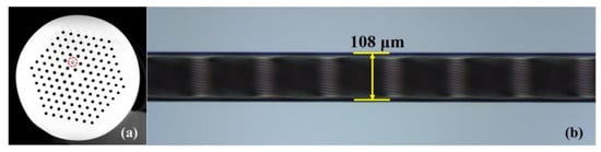(a) Cross-section of the LFTPCF where one hole was filled with a standard refractive index (RI) liquid. The hole was outlined with a red circles. (b) Side-view microscope images of the LFTPCFs.