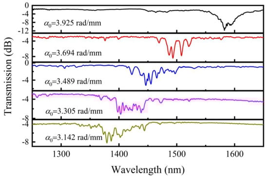 Transmission spectra of LFTPCFs with α0 varying from 3.142 to 3.925 rad/mm.