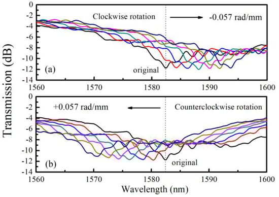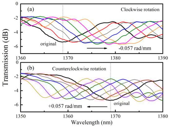 In the torsion test system (Figure 7), LFTPCF sample was fixed between a rotator and a fiber holder. The distance between the two fiber holders (L) was 90 mm. The rotator can be rotated in clockwise (+) or counterclockwise (−) directions that are the same or opposite to the direction of PCF twisting, respectively. The two ends of the fiber are connected to a broad band ASE light source (wavelength range 1250–1650 nm, FL-ASE, FiberLake, Shenzhen, China) and an optical spectrum analyzer (OSA) (resolution 0.5 nm, scan speed 20 nm/s, AQ6370C, Yokogawa, Tokyo, Japan), respectively, to measure the transmission spectra. The applied twist rate α (rad/mm), the twisted radian per millimeter along the fiber in the torsion test process, can be estimated via the following relation, α = θ/L, where θ is the angle of rotation that can be varied from 0 to ±4π/3 rad in an interval of π/6 rad. Larger rotation angles have yet to be applied to avoid damaging the fiber in the torsion test.