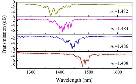 To study the effect of liquid RI on torsion sensitivity, samples with an initial twist rate of 3.142 rad/mm are fabricated to be filled with different liquid materials. Subsequently standard RI liquids (nl) with 1.482, 1.484, 1.486, and 1.488 are filled in these samples, respectively. The transmission spectra of these samples are measured at room temperature as shown in Figure 10. It is easy to find that the resonant dip red shifts with nl increasing in a wavelength range from 1300 to 1600 nm.