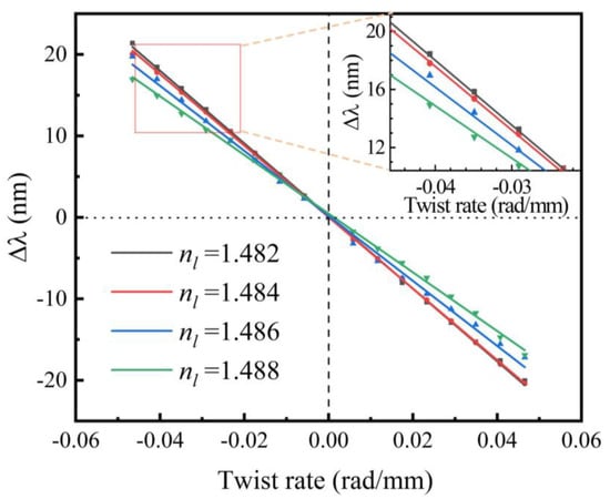 For instance, the spectral responses of sample with nl = 1.482 for different angles of rotation are plotted in Figure 11. The wavelength variations of the resonant dips are plotted versus α, as illustrated in Figure 12. The torsion sensitivities of these samples are calculated through linear fitting and listed in Table 2. As nl decreases, the torsion sensitivity of the samples increases from 360 to 446 nm∙mm∙rad−1. According to the results of simulation, the decrease of nl can lead to an increase of neff. It is shown that the changing trend of ST is same as that of neff.