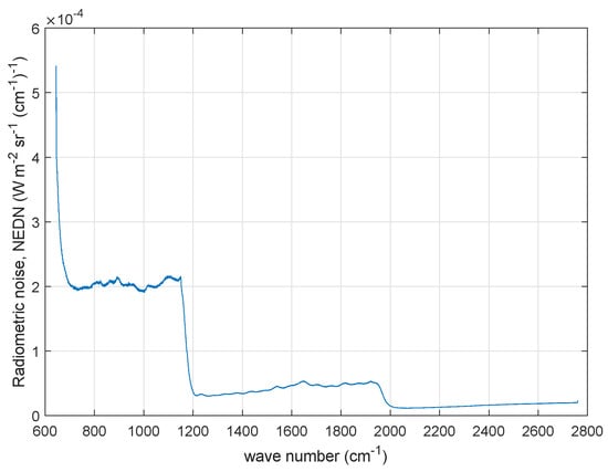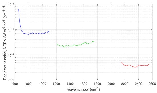 The characterization of the radiometric noise, or more in general the observational covariance matrix, of remote sensing instrumentation is an important step to fully exploit the related observations for the estimation of geophysical parameters. The observational covariance matrix, , is an ingredient of the so-called Level 1 (L1) data. For infrared sensors, such as those we deal with in this paper, L1 data correspond to the calibrated spectral radiance. The diagonal of corresponds to the variances of the observations and their square root is what is normally referred to as the radiometric noise. This expresses the precision of measurements because of instrument noise. The off-diagonal terms of (normally termed as covariances) give the inter-correlation among observations. Generally, off-diagonal terms are negligible; however, non-zero covariances can arise because of post-elaboration of L1 data, such as mathematical apodization (e.g., see []), but they can also reflect unexpected noise sources, such as mechanical micro-vibrations, thermal effects and so on [,,].