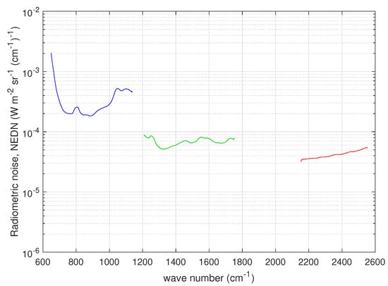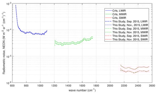 Figure 3 shows the radiometric noise for CrIS in terms of NEDN (e.g., []). The data shown in Figure 3 have been reprocessed because the original radiometric noise refers to unapodized spectral radiances at the FSR mode of 0.625 cm for all CrIS bands. The data points for band 2 (MWIR) have been reduced a factor and those for band 3 (SWIR) a factor 2 to take into account the resampling at 1.25 and 2.5 cm, respectively. Considering the work by Han et al. (2015) [], this should be kept in mind when comparing to our results that we show in Section 3. The radiometric noise figures in Figure 3 are referred to as CrIS nominal noise in the remaining of this paper. Unlike IASI, for CrIS, there is no special prescription for the off-diagonal terms of the covariance matrix, which is normally assumed diagonal. This applies indifferently to unapodized radiances in the FSR mode or NSR mode.