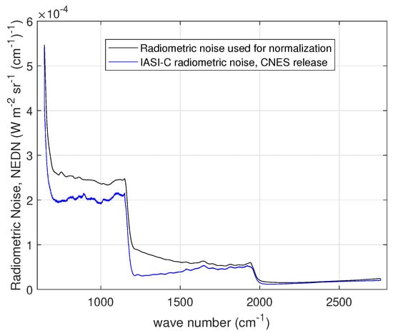 Results for the radiometric noise for the IASI-C instrument. The figure also shows the noise used for normalization and the nominal radiometric noise according to the CNES release [].