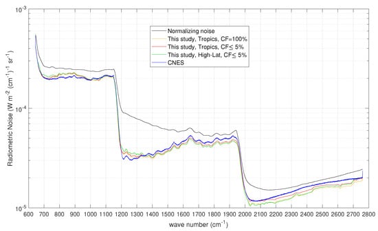 Results for the radiometric noise for the CrIS instrument. The figure also shows the noise used for normalization, which in this case corresponds to the CrIS radiometric noise assessed in []. The results have been averaged over the nine CrIS pixels or IFOVS.