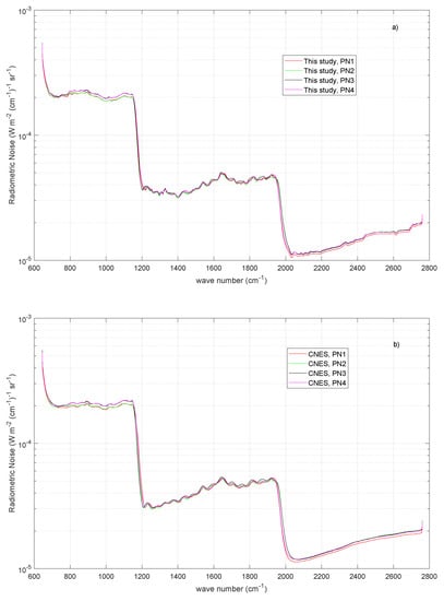 The results for the radiometric noise are summarized in Figure 12 and compared to that shown in Figure 4. The dataset used in the analysis is made up of tropical spectra recorded on 15 July 2019 over the Indian Ocean. For the sake of brevity, no attempt was done to perform an analysis for single pixels. The analysis was also performed with spectra at higher latitudes and we confirmed the same results we show for the tropical belt.
