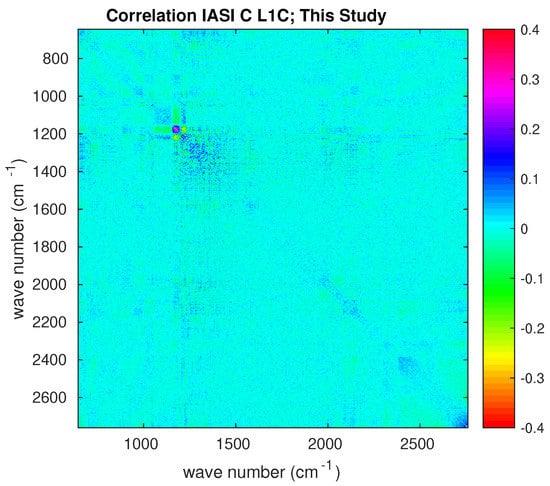 In Figure 2, it is quite clear that there is an excess of correlation corresponding to spectral range centered at 1200 cm; an excess of correlation, although fainter, is also seen at 2000 cm. These are the spectral intervals where IASI bands 1 and 2 and bands 2 and 3 are merged, respectively. At both merging of bands, we have a long-range correlation structure with a cyclic behavior, which extends back to the beginning of band 1 at 645 cm. We stress that this behavior has been long ignored and not modeled for the covariance matrix of both IASI-A and -B. The structure was first evidenced by Serio et al. [], Masiello et al. [], who assessed that the correlation was not a result of atmospheric signal. We also stress that. for the correlation matrix shown in Figure 2, the covariance model has to be intended as an average over the four IASI pixels, and pixel-to-pixel variations can be expected. Finally, we note that the IASI-C noise model is still under analysis at CNES and refinements could be expected, although not changing the pattern shown in Figure 2. The radiometric noise and related covariance matrix in Figure 1 and Figure 2 are referred to as IASI nominal noise in the rest of this paper.
