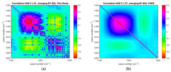(a) IASI-C transformed to correlation matrix estimated on the basis of Earth-scene views. The figure zooms in the spectral range corresponding to the merging of IASI bands 1 and 2. (b) The same as in (a), but now the CNES release is shown for comparison. The diagonal has been subtracted to allow for a better visual inspection for possible correlation patterns. Results have been averaged over the four IASI pixels.