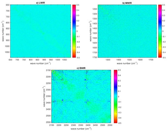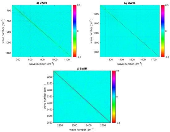 HIRAS estimated correlation matrix (dataset corresponding to the tropical belt and recorded on 8–9 June 2018) for: (a) LWIR; (b) MWIR; and (c) SWIR. The sampling is 0.625 cm in each band. In all correlation matrices, the diagonal has been subtracted to allow for a better visual inspection for possible correlation patterns. Results have been averaged over the four HIRAS pixels.