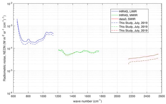 To summarize our analysis, Figure 14 compares the radiometric noise of the three instruments. For CrIS, we used the data provided to us by Han et al. [] because they apply to the CrIS standard sampling of 0.625 cm and, therefore, can be directly compared to the HIRAS radiometric noise as estimated in this study (see Figure 12). For IASI, we showed values calculated at the present sampling of 0.25 cm (level 1C, apodized data) and those after properly rescaling IASI at CrIS nominal sampling (IASI at CrIS resolution) of 0.625 cm unapodized.