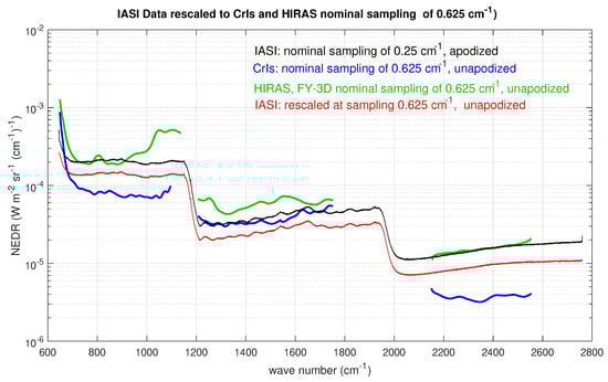 Comparison of IASI, CrIS, and HIRAS radiometric noise. The CrIS data shown in the figure are those provided to us by Han et al. [], which apply to the CrIS standard sampling of 0.625 cm. In this way, they can be directly compared to those of HIRAS. For IASI, we show both the radiometric noise at the original sampling and those properly rescaled at CrIS standard sampling.