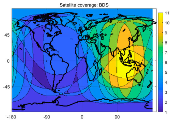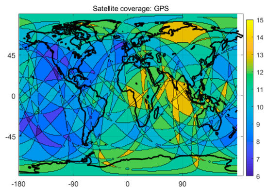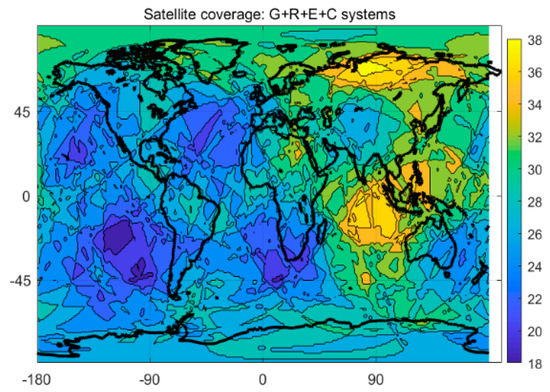 Compared to the single-system model, the multi-system model can provide more available satellites and better spatial geometry of the satellite constellation, which can theoretically yield significant improvement in positioning performance. Figure 3 and Figure 4 show the satellite coverage of the single GPS system and the G + C + R + E systems on a global scale at 0:0:00 on the 150th day of 2018. As shown in Figure 3, numbers of the satellite for a single GPS system range from 6 to 15, while the minimum number of available satellites for the G + C + R + E systems are 18, far more than the number of usable satellites provided by a single GPS system.