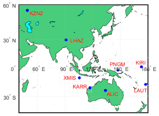 To verify the model and analyse the ISB parameter characteristics, the data of eight MGEX stations for 28 days were selected (150th to 177th day in 2018). The criteria of the selection of the station is based on the following: (1) the station should be able to observe four-system satellites simultaneously. That is, the number of satellites observed by each system must be greater than 1 at the same time; (2) the reference coordinates of the station can be found in the file (gbm.clk). The Beidou second-generation satellites show poor visibility in the worldwide at present (Figure 1); thus, to satisfy the first requirement, most stations selected in this experiment were distributed in the Asia-Pacific region (Figure 2) to ensure that the tracking station could observe a sufficient number of BDS satellites. The observation data required pre-processing prior to the experiment. The precise reference coordinates of each station in the file (gbm.clk) were extracted to replace the prior coordinates in the observation file, and the coordinate bias in three directions (i.e., east, north and up) were obtained by filtering, which can be considered as positioning accuracy [28].