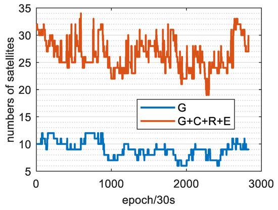 Available number of satellites for single GPS and G + C + R + E systems.