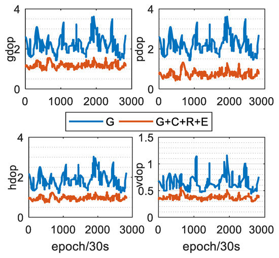 DOP values of single GPS and G + C + R + E systems.