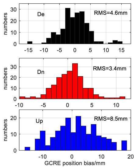 Figure 7 shows that the coordinate bias of each station of the four-system model on the 150th day of 2018. The positioning biases in the E, N and U directions of all stations were at millimeter level, among which the positioning biases in the three directions of the lhaz station were all less than 1 mm. To further analyze the positioning of the uncombined PPP model, Figure 8 shows the coordinate bias statistics of all stations for 28 days, where Figure 8 denote the E, N and U directions, respectively, wherein the y axis indicates positioning bias in millimeters, and the ordinate indicates the number of stations. As can be seen, the RMS (Root Mean Square) of the positioning bias in the E, N and U directions were 4.6 mm, 3.4 mm and 8.5 mm, respectively.