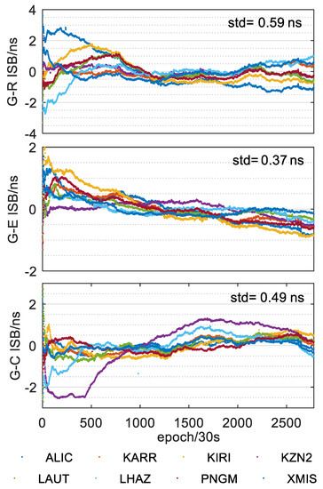 Through the epoch by epoch filtering calculation, the time series of inter-system bias were obtained, among them, G-R represents the inter-system bias between GPS and GLONASS, and G-E represents the inter-system bias between GPS and GALILEO, and G-C represents the inter-system bias between GPS and BDS.The intra-day variation of the ISB parameters was analyzed after determining their respective mean values. Figure 9 show the time series of the ISB parameters for the G-R, G-E and G-C systems of each station on the 150th day of 2018 (after deducting their mean values), respectively. As can be seen, the variation of the parameters among the three groups of ISB parameters was relatively stable within one day. The ISB parameter values of most stations were within ±1 ns, and the standard deviations of the three groups ISB were all less than 0.6 ns. Among them, the ISB parameter between the GALILEO and GPS systems were the most stable and the standard deviation was the smallest, which may be related to the GALILEO system’s good signal quality.