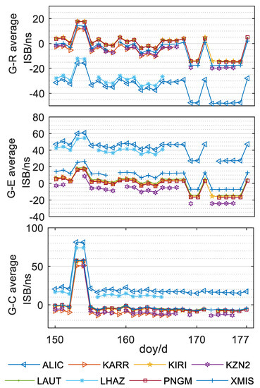 - The mean ISB parameters value of single-day solution of each station is not stable in the time period, and the amplitude of jump is irregular (up to 60 ns); however, the ISB parameters of all stations show similar variation trends and amplitude on the same day. This situation is independent of receiver, which may be ascribed to satellite reference clock of different system.