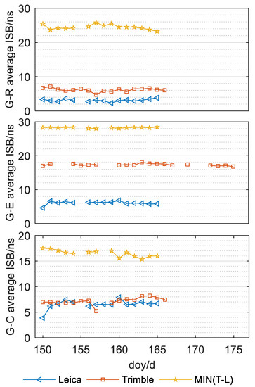 In Figure 12, the y axis represents the difference values of the three groups of ISB parameters of two different stations, respectively, and the x axis indicates the target day. Corresponding to three different types of ISB parameters, it should select two stations with the largest or smallest mean value of the single-day solution of the ISB parameter for each receiver type, and, in the process, due to the missing observation values on certain days from some stations, for fairness, it is considered that the ISB parameters of the corresponding type of measuring station are still the largest or smallest in the subsequent missing days. Blue triangles in Figure 12 represent the difference between the maximum and minimum ISB mean values of stations equipped with Leica type receivers in each day, and red Squares represent the difference between the maximum and minimum ISB mean the values of stations equipped with Trimble type receivers in each day. The yellow pentagonal star in Figure 12 shows the minimum difference between ISB mean values of stations equipped with Trimble type receivers and ISB mean values of stations equipped with LECIA type receivers in each day. As shown in Figure 12, apart from the graph for the ISB_GE parameter, the maximum change in amplitude of the mean single-day ISB value between two stations with the same type of receiver were all less than 9 ns, but the minimum change between two mean values of the single-day solutions corresponding to two stations equipped with two different kinds of receivers were all greater than 15 ns. Even considering the ISB_GE parameter, the minimum difference value of the mean values of the single-day solutions of the ISB parameters between two stations equipped with different kinds of receivers was far greater than those equipped with the same receiver. Based on the analysis shown in Figure 12, the mean value of the single-day solutions of ISB parameters between two stations equipped with the same kind of receiver demonstrates a small change range, and the change is relatively stable; however, it varies significantly for two stations equipped with different types of receivers. Therefore, we conclude that there is a clear relationship between the ISB parameters and receiver type.