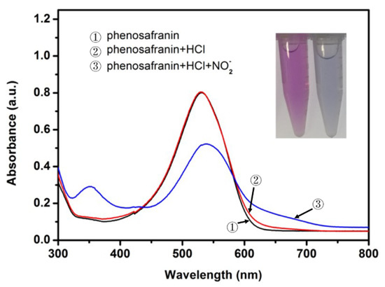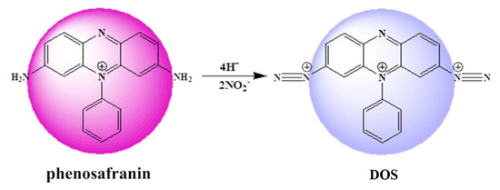 To improve the practicality of the sensing platform for nitrite detection in the real world, we present a simple and effective colorimetric sensing platform based on the Griess assay. As shown in Figure 1, commercially cost-efficient phenosafranin (serving as the acting site and signal reporter) with large conjugated structure (purple) can be diazotized to form a blue diazonium salt (DOS) by nitrite under acidic conditions in the presence of nitrite in aqueous solution. Thus, qualitative and quantitative detection of nitrite was achieved according to the changes in absorbance of the UV-visible spectrum. In addition, the sensing platform was able to detect nitrite spiked into ham sausage, bacon, and sprouts with remarkable recovery. The results demonstrated that the sensing platform as presented displays excellent sensitivity and is robust against disturbance, and is a promising candidate for nitrite analysis in real samples.