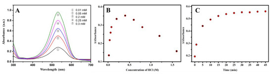 Optimization of concentrations of (A) phenosafranin (0.01, 0.05, 0.2, 0.25, 0.3 mM), (B) HCl (0.025, 0.05, 0.075, 0.1, 0.2, 0.4, 0.6, 0.8, 1.2, 1.6 M), and (C) reaction time (0, 1, 5, 10, 15, 20, 25, 30, 35, 40, 45 min).