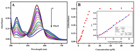 (A) UV spectra of phenosafranin (0.25 mM) at HCl concentration of 0.4 M versus with various concentrations from 0 to 100 μM and (B) corresponding ΔA at 532 nm of the sensing system at respective concentrations; (inset B: linear relationship between ΔA and concentrations ranging from 0 to 20 μM).