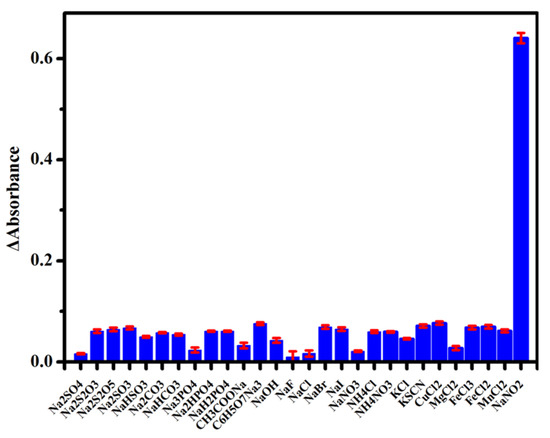 We conducted an interferences study to verify the selectivity of the colorimetric sensing platform. We selected 27 potential co-existing organic salts or alkali as interference chemicals to be tested. As shown in Figure 6, ΔA at 532 nm of the sensing platform after reaction with different substances (350 μM Na2SO4, NaHSO3, Na2S2O3, Na2SO3, Na2S2O5, Na2CO3, NaHCO3, Na3PO4, Na2HPO4, NaH2PO4, CH3COONa, C6H5O7Na3, NaOH, NaF, NaCl, NaBr, NaI, NaNO3, NH4Cl, NH4NO3, KCl, KSCN, CuCl2, MgCl2, FeCl2, FeCl3, and MnCl2) under optimal conditions were recorded, suggesting little influence on the sensing platform from these interferences. In contrast, ΔA (absorbance change) at 532 nm of the as-presented sensing platform after incubation with 35 μM of NaNO2 under the same detection conditions significantly increased, indicating a good selectivity of this sensing platform toward . The selectivity of the sensing platform was assigned to the diazotization reaction of phenosafranin with . The results indicated that the colorimetric sensing platform presented here has a good anti-disturbance ability.