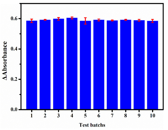 To evaluate the stability, we recorded ΔA at 532 nm for the sensing platform upon incubation with 35 μM NaNO2 under the optimized detection conditions. Ten batches with six replicates for one batch were tested and the results are shown in Figure 7. An excellent reproducibility (relative standard deviation (RSD) = 1.59%) of the colorimetric sensing platform was obtained.