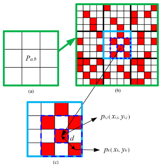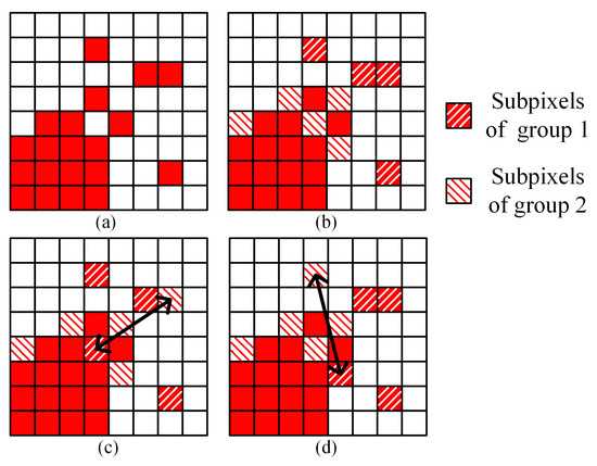 Figure 2a shows a mixed pixel with two kinds of land cover. Several subpixels with small gravitational values in the corresponding land cover form a group, and two groups of these subpixels are shown as slashed blocks in