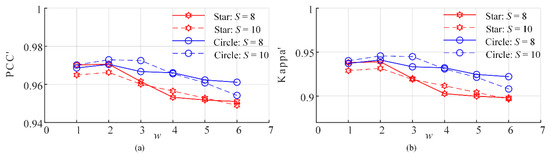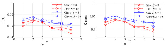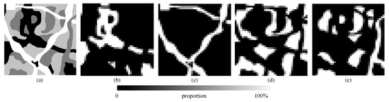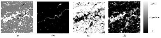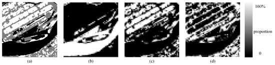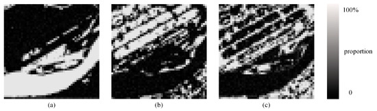 According to the proportions of land cover in the mixed pixels, the subpixels with corresponding classes are randomly allocated in each mixed pixel. Calculate the total attractiveness of each mixed pixel by using either Equation (2) or Equation (4). Equation (2) considers the distance between the central subpixel and neighboring subpixels as the weight function, while Equation (4) treats neighboring subpixels with the same weighting value. We denote the algorithms based on Equations (2) and (4) as PSA_MSA1 and PSA_MSA2, respectively.