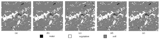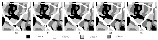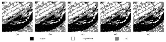 Figure 2c,d show two possible swapping results. This method constrains the subpixels, which are randomly swapped by SA, to subpixels with small gravitational values within their own classes.