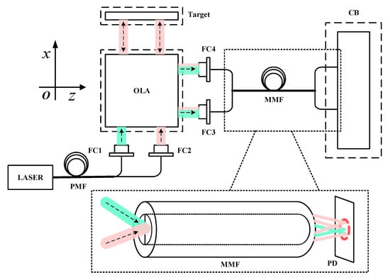 As shown in Figure 1, in the interferometer measurement system with fiber-coupled delivery, the single-frequency polarized beams generated by the laser are delivered to the fiber couplers (FCs) by the PMFs, and then into the optical lens assembly (OLA) to form the reference arms and the measurement arms. The measurement arms carry the Doppler phase shift of the target. The reference arms and the measurement arms are coupled to the MMFs by FCs after passing through the OLA, and are finally delivered to the control board (CB), where photoelectric conversion and phase discrimination are completed. The irradiance signal received by the photodetector (PD) in the CB is the sum of each mode component of the measurement arm and reference arm.
