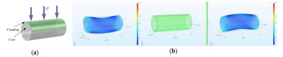 In the COMSOL model, the simulation is divided into two steps. Firstly, the stress distribution and deformation distribution of the MMF under periodic load are calculated by using the interface of ‘solid mechanics’. Secondly, the obtained stress distribution is substituted into Equation (6) to calculate the refractive index of each part of the fiber after strain. The ERI of the fiber is calculated by using the ‘mode analysis’ module in the ‘wave optics’ interface.