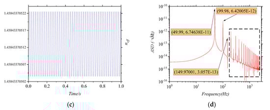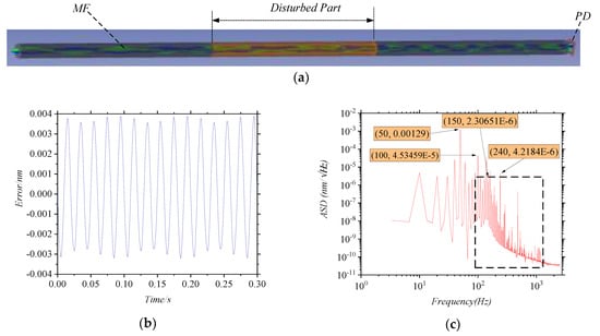 Since the change of the ERI is small and the actual length of the MMF is much longer than 1 mm in the COMSOL model, we first amplify the refractive index change by using a certain factor, and then assign the values to the optical fiber in ZEMAX simulation. As shown in Figure 3a, the measurement arm and the reference arm are coupled to the MMF and finally reach the detector for processing. In this simulation, we divide the fiber into three parts, and the middle part is disturbed. The ERI obtained from COMSOL simulation is given to the MMF in the disturbed part, and the final error is obtained by calculating the irradiance signals detected by PD. In the ZEMAX model, the frequency difference between the measurement arm and the reference arm is 240 Hz, the sampling frequency is 5 kHz, and the sampling time is 1 s. Figure 3b is the measurement errors from 0.35 s to 0.65 s. The ASD of the measurement errors is analyzed in Figure 3c. It can be seen that the main frequency is 50 Hz, at which the amplitude of the error is 0.00129 nm/√Hz. There is a second-order frequency of 100 Hz, which is consistent with the ERI’s and the load’s frequencies. In the black box in Figure 3c, the ASD of the error has the higher-order frequencies as well. The component at 240 Hz is the error of phase discrimination process, which is consistent with the frequency difference.