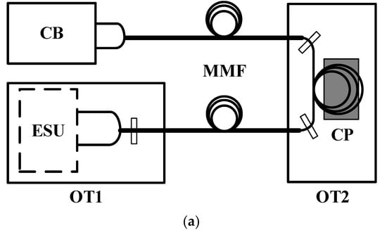 There have been many advances in the research of MMFs and the sensor based on MMFs [8,9,10,11]. The theory of how the beam propagates in MMFs has also been improved. The beams propagate in MMFs with multiple modes, each of which has an effective refractive index (ERI) [12,13,14,15]. Similar to PMFs, MMFs will generate stress and deformation when disturbed. Due to the optic-stress effects, the refractive index of the fiber will change [16,17,18]. There are many interferometers, and the measurement arms and the reference arms of these interferometers cannot be guaranteed to be parallel and coincident in use [19,20,21,22,23,24]. In some applications of interferometers with MMFs such as the relative displacement measurement of the dual wafer stage, the interferometers inevitably move with one stage [25]. In this case, MMFs are disturbed by the motion of the interferometers. The measurement errors caused by disturbed MMFs needs to be studied to achieve higher measurement accuracy, which is beneficial for designing an interferometer measurement system with an interference angle that can be adapted to wider application.