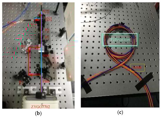 To explore the characteristics of the error caused by disturbed MMFs, the experiment is shown in Figure 4a. To prevent experimental set-up (ESU) from being affected by the vibration, ESU was installed on the first optical stage (OT1), and a segment of MMF was fixed on the second optical stage (OT2). In Figure 4b, the laser (model: ZMI7702 Laser Head, ZYGO, Inc, Middlefield, CT, USA) is the dual frequency laser which emits two beams that are linearly polarized in a coaxial direction. They have different frequencies and have orthogonal polarization states. After the dual-frequency beams passes through polarizing beamsplitter (PBS), it is divided into p-polarized beams and s-polarized beams, and then takes a different death path to form the measurement arm and the reference arm. After passing beamsplitter (BS1) and polarizing plate (P1), the measurement arm interferes with the reference arm. The interference beams are divided into two beams through beamsplitter (BS2), and then pass through fiber couplers (FCs) into MMFs, which are finally delivered to the control board (CB) (model: ZMI4100TM Series Measurement Board, ZYGO, Inc, Middlefield, CT, USA) for processing. As shown in Figure 4c, a segment of MMF is fixed on OT2, on which a cellphone is placed to vibrate at a fixed frequency and amplitude.