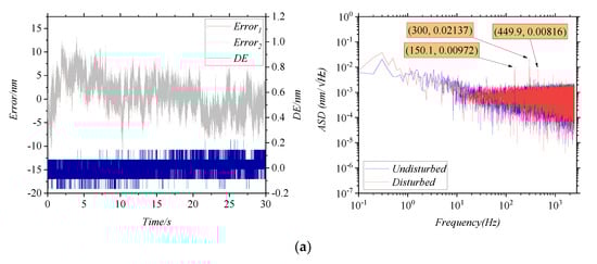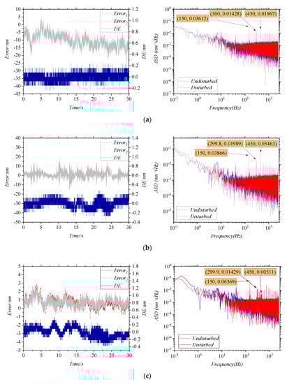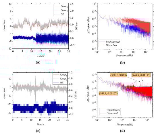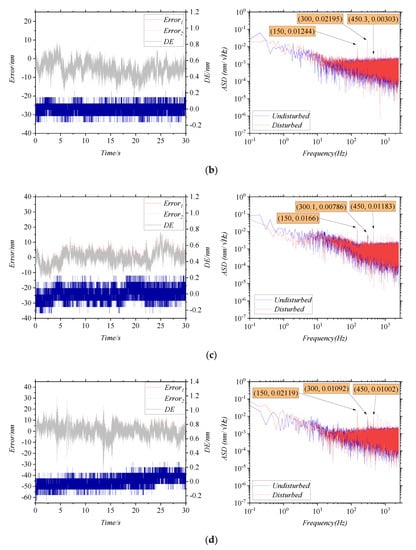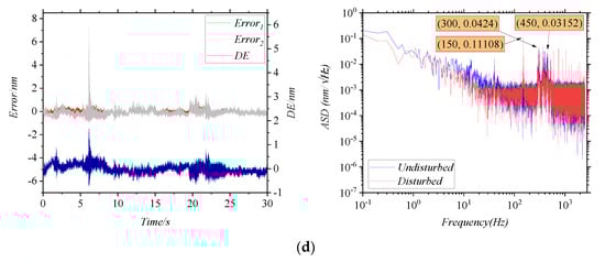 In Figure 5a,b, the MMFs are disturbed by the hands. The results of DE in the first 10 s and in the last 10 s are significantly different, which indicates that the error increases significantly when the MMFs are disturbed. To get the influence factors of error more accurately, the results of cellphone disturbance are investigated later. In Figure 5c, the MMFs are disturbed by the cellphone, and the frequency of the disturbance is 150 Hz. As shown in Figure 5d, the ASD of the DE before and after the disturbance is different, and it can be seen that these characteristic frequencies appear after the disturbance: 149.9 Hz, 300 Hz, 449.9 Hz, etc. These frequencies coincide with the first-order, second-order and third-order vibration frequencies, which is consistent with the results of simulation. Meanwhile, it was verified that the disturbance of MMFs causes measurement error, and the characteristic frequency of the error matches the frequency of disturbance.