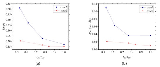 (a) The 3σ of the DE vary with IAC/IDC in different cases. (b) The ASD of the DE vary with IAC/IDC in different cases. In case 1, the interference angle is changed. In case 2, the irradiance ratio is changed.