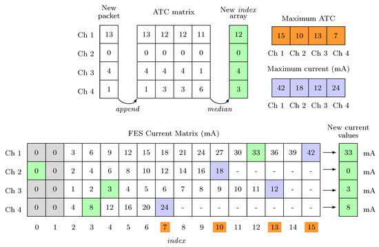 - Maximal ATC: The therapist has to repeat the movement to be calibrated at least four times. The maximal ATC value produced by the subject is calculated as the median value among the maximum of each repetition. This value limits the index dimension of the array, related to the calibrated channel, inside the FES Current Matrix, highlighted in orange in Figure 8.