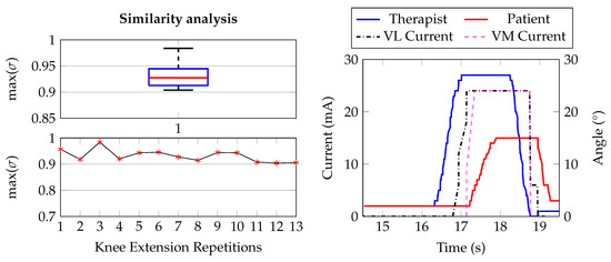 - Current limitation: We define the maximal current, useful to properly reproduce the movement, as the 110% of the current able to produce a 30% AROM variation in the stimulated subject. If the goniometer is not used, this step can be visually performed. Maximal Current values, represented in blue in Figure 8, related to the indexes defined by the Maximal ATC, define the proper stimulation values inter-step.