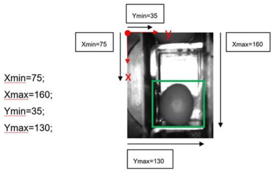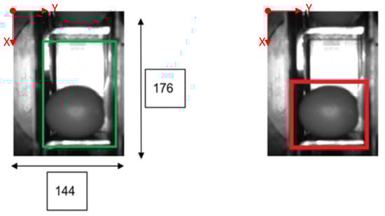 The following Figure 1 and Figure 2 show some examples of 176 × 144 pixel-images with the (X,Y) reference system. As shown in the figures, the olive is restricted in the X-axis (the same pocket confines the olive to its space) and, therefore, the selection of the parameters of ROI in that axis is constant. There is a possibility for the olive to move in Y-axis, consequently leading to a deviation of the dimensions of ROI. However, it is empirically proven that, due to the inclination of the chain and the upward movement of the olive, gravity, inertia and some elements of the machine (brushes, for example) forces the olive to stay in a similar position. Variations may be identified in orientation, which is the subject of this paper.