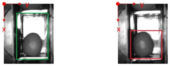Example of the use of region of interest (ROI) in an olive in a normal position. The red point corresponds to the origin of coordinates for pixels. The green rectangle comprises the pocket within its walls and depth and limited by the previous and the next pocket of the feed chain. The red rectangle is the ROI.