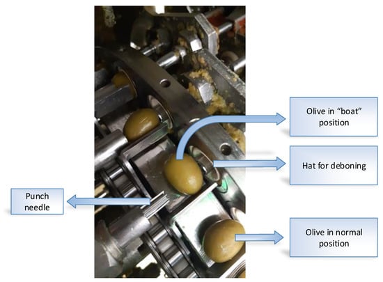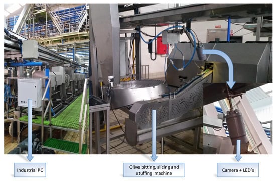 Olives were pitted and stuffed by hand until the 1970s. As labor costs gradually increased, the need to mechanize both processes arose. The industrialization of the olive industry progressed at a slow pace, and the first continuous olive pitting machines appeared in 1975 [1]. Current models have improved and are able to pit olives at a rate up to 2500 olives/min. However, there has been a lack of electronic improvements because the ongoing mechanical improvements in olive pitting machines have limited the incorporation of new technologies and fine adjustments. It is worth mentioning however some of the few advances in this area, including performance optimization and remote error detection [2]. The olive pitting minimum error rate of traditional systems is 1–2% (if the machine is correctly adjusted) and cannot be improved through mechanical adjustments although this error can increase due to the poor calibration of an olive pitting machine. The consequences of these error increases include a greater fruit loss and food safety issues, because the pitting process is not completely ensured, it may result in a low-quality product. The growing competitiveness in producer countries, due to a globalized market, and the increase of food safety measures have led to new technological solutions. These solutions are aimed at improving the reliability of olive pitting machines during the pitting process by removing the stone completely and increasing their productivity for better competition with other producers.