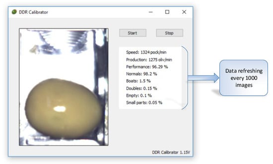 One limitation of the system currently developed is that it only allows for the diagnosis of the DRR machine so that the operator can recalibrate it. In a future paper, the possibility of ejecting those olives which are badly positioned (“boat” olives or doubles) or which have defects (small pieces) in the feeding chain will be presented. In this way, “boat” olives or doubles being badly de-stoned will be avoided. Likewise, it will assure that the olives which break upon entering in the feed chain causing small pieces do not get to the de-stoning area, thus avoiding, on the one hand, the loss of product (1–2%), and on the other hand, the accelerated deterioration of the punch needles and hats for deboning.