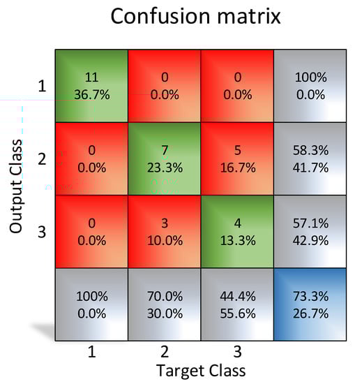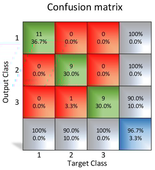 Specific studies in the agri-food sector and the related behavior of neural networks have been considered. It is worth mentioning the studies conducted by Guichao et al. [7,8,9] on detection systems for the artificial visualization of fruits through RGB space color analysis and robotic systems. In the case of the classification of apples, Yang et al. [10] provide positive results. Yang’s investigation used three layers of 9-6-3 neurons, with 96.6% accuracy. Nagata et al. [11] developed a grading system for fruit and vegetables using neural network technologies, obtaining a high percentage of accuracy for strawberries and green peppers (94% to 98% and 89%, respectively). Likewise, Behrooz et al. [12] applied machine vision and artificial neural network (ANN) for modelling and controlling the grape drying process, offering a new method for predictive modelling of the grape drying process for the on-line monitoring and controlling of the process.