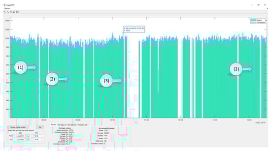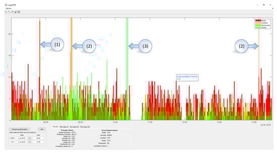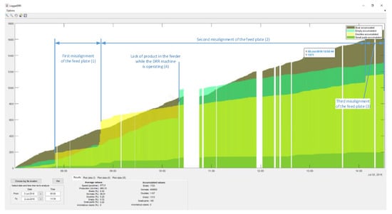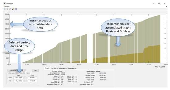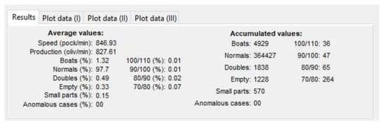 An application (“LoggerDRR”) has been developed to analyze the operation of the olive pitting machine with GUI by Matlab (Figure 15). The most relevant parameters of this application will be indicated below: