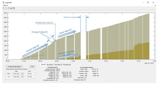 This type of graph allows us to observe if the calibration process entails a comprehensive improvement in performance or, conversely, whether an improvement in a parameter after an adjustment entails a reduction in goodness of fit in another. In (1), (2) and (3) it can be observed how the feeding plate goes out of adjustment a little more each time, which has an impact on the number of doubles and small parts. During all of this time, the growth in the number of “boat” olives is monotonous which means that there are no misalignments in the straightening brush. For its part, the number of empty (4) increases abruptly each time a lack of product in the feeder when the DRR machine is working. At times, the data analysis without accumulating data can be interesting in order to see the effect of specific actions. In Figure 19, the peaks in the “boat” olives/doubles (1), of only doubles (2), empty (3) are observed due to the action of isolated adjustments or operation of the machine. In all of the cases shown, these actions are unfavorable (either calibration or operation).