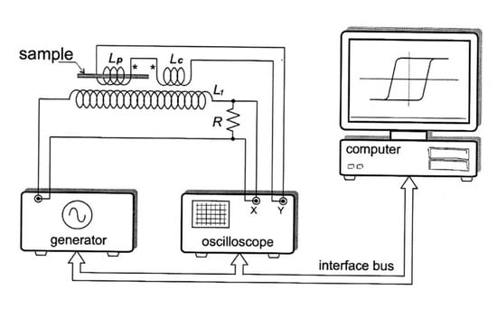 Hysteresis loops were recorded by using the fluxmetric method previously successfully employed for studies of magnetic microwires by us [24,25,27]. The schematic picture of the experimental setup is provided in Figure 1. The electromotive force, ϵ, in the pick-up coil with N turns produced by the change of magnetic flux, ϕ, is given by the following equation [29,49]: